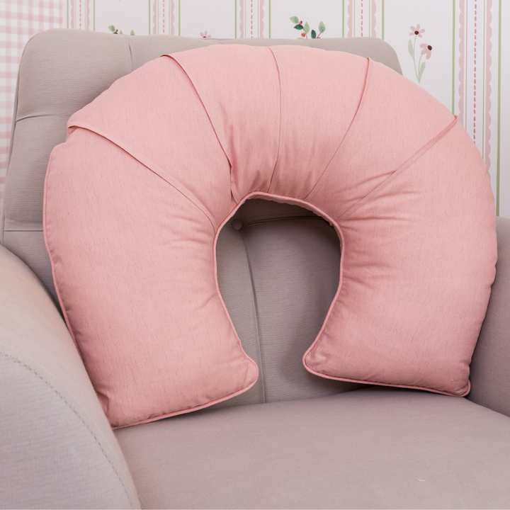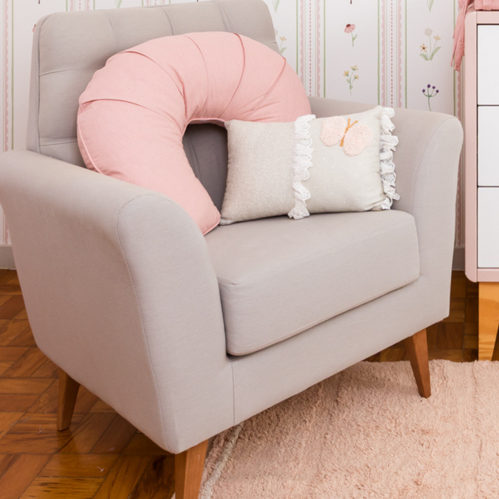 Com formato anatômico em “U” e acabamento nervurado delicado, ela envolve mãe e bebê com conforto e charme em cada momento da amamentação.