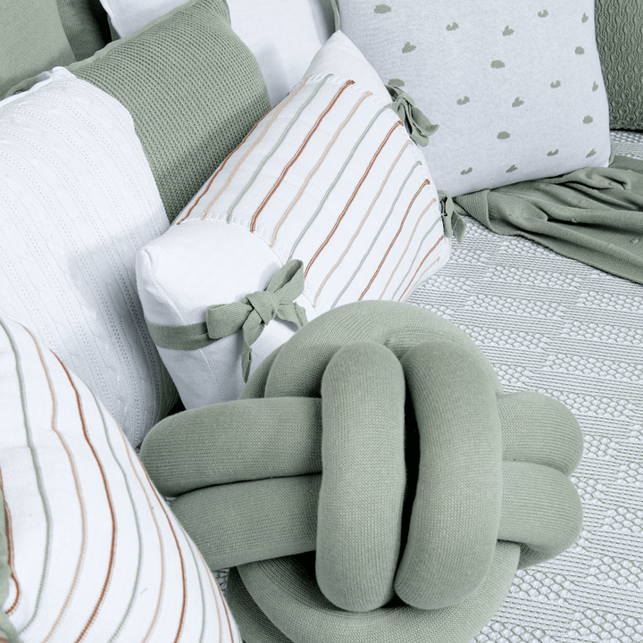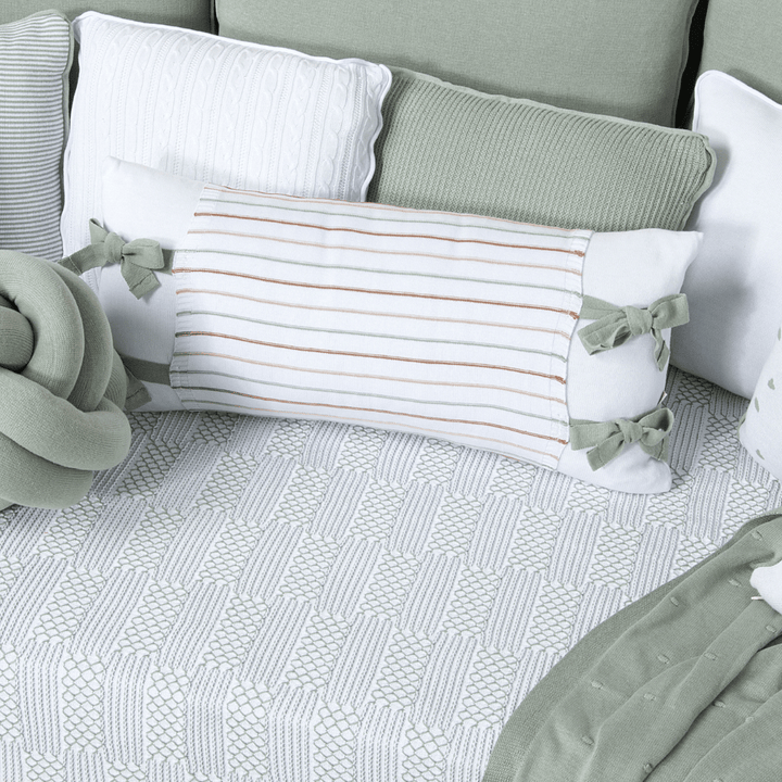 Confeccionada em tricot com fio de algodão sustentável, a Almofada Decorativa Retangular Meia Malha Branco com Avental Taylor Branco com Verde Oliva é perfeita para trazer conforto, elegância e responsabilidade ambiental ao quarto do seu bebê.