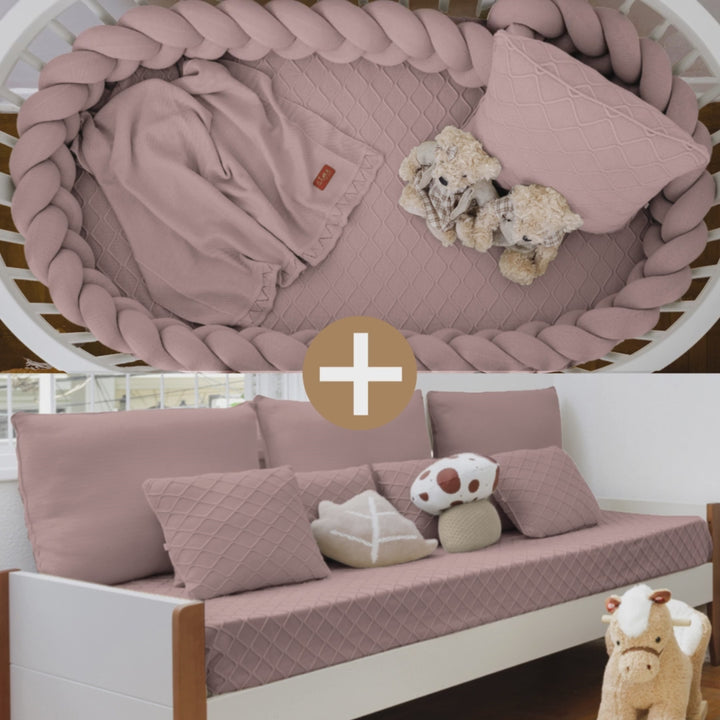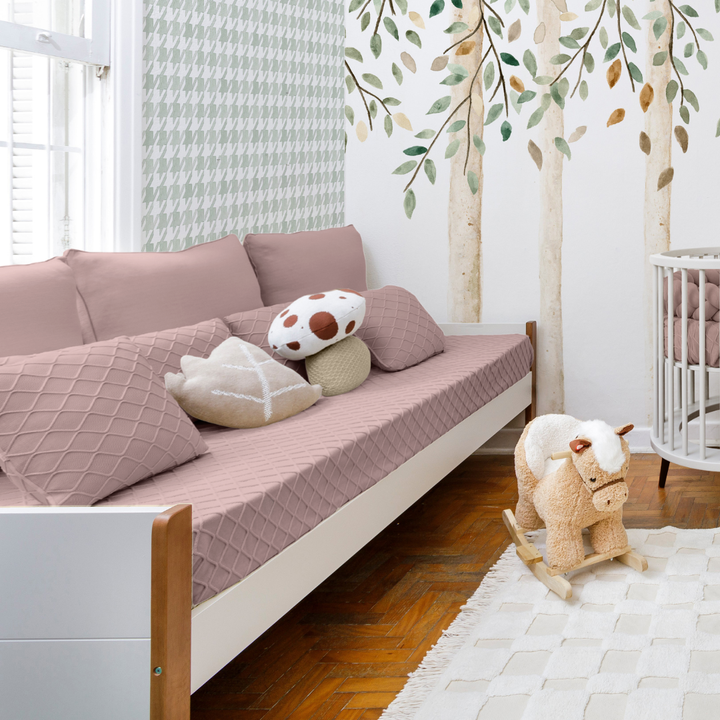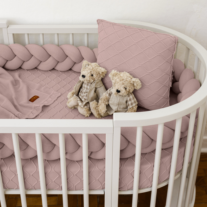 Enxoval Berço e Cama Tricô 100% Algodão – Combo 11 Peças Cozy Cottage Rosa Velho