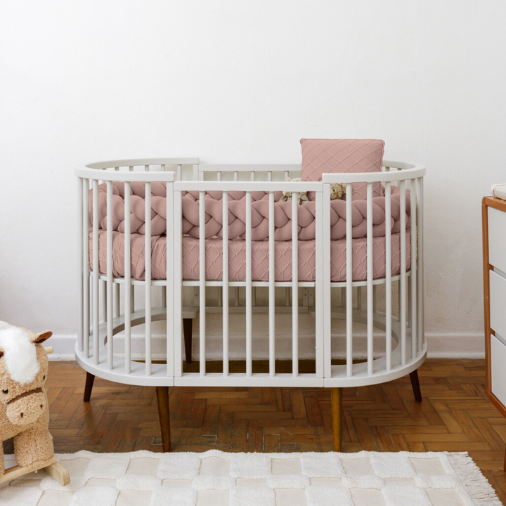 ✨ Proteção, conforto e estilo em cada detalhe. A trança cria uma barreira suave e segura, enquanto o cobre leito e a almofada decorativa completam o berço com elegância.