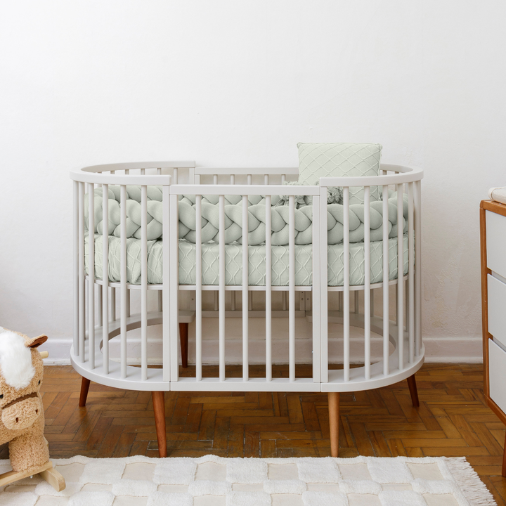 ✨ Um conjunto prático e elegante que garante proteção, conforto e charme ao berço, com textura suave e acabamento artesanal.