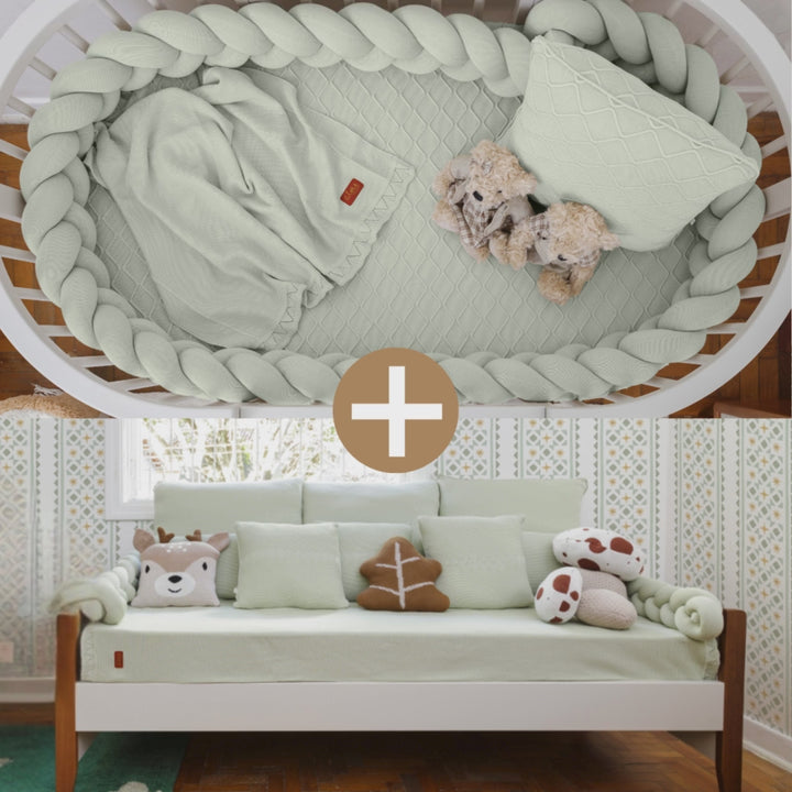 Um conjunto completo que combina o charme do Kit Berço Cozy Cottage e o equilíbrio natural do Kit Cama Forest, unindo design artesanal, conforto e harmonia em cada detalhe.