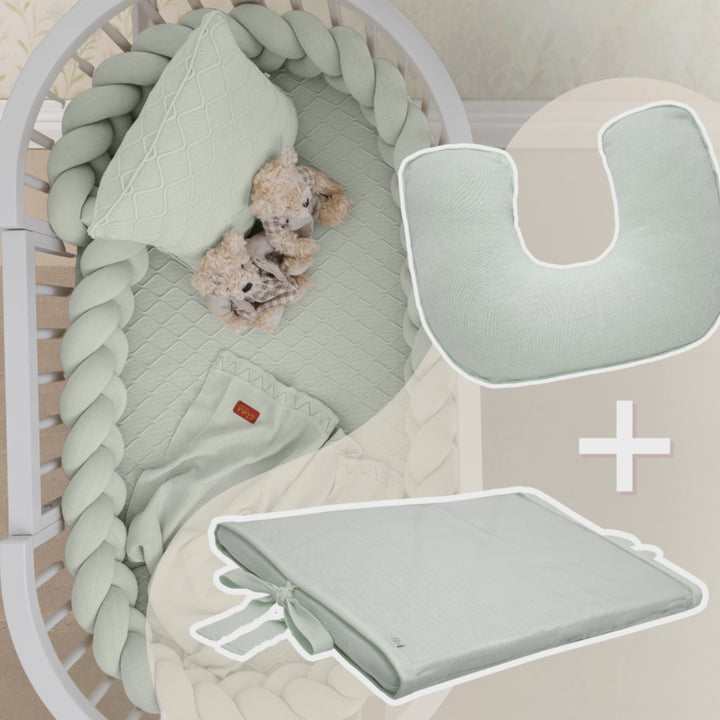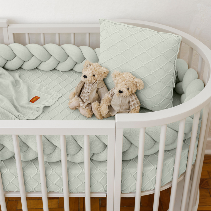 A trança protege o bebê com suavidade, enquanto o cobre leito e a almofada decoram com charme e harmonia. -