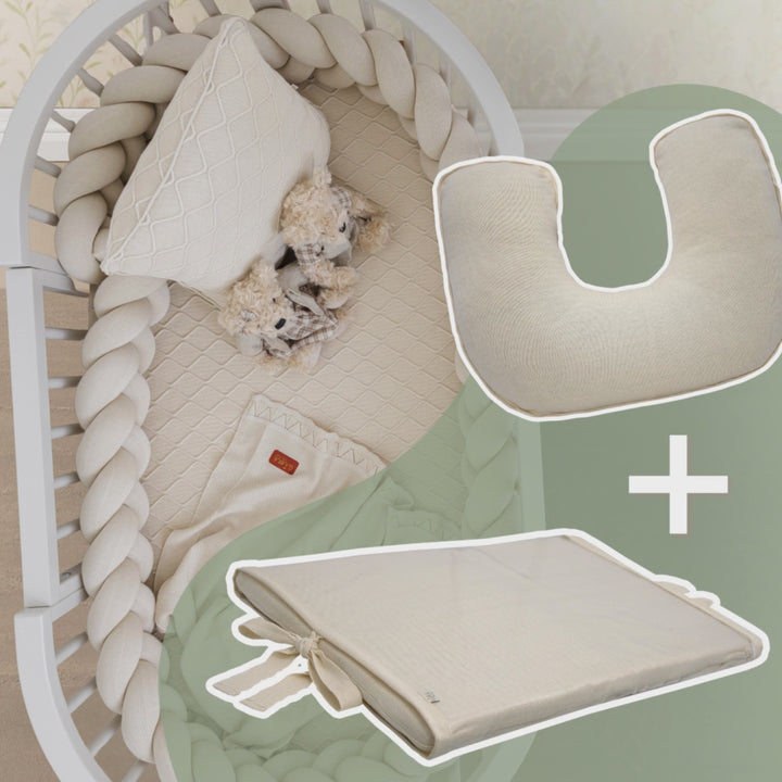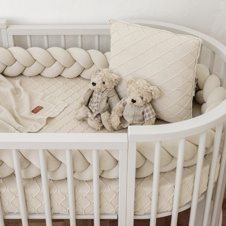 A trança protege o bebê com suavidade, enquanto o cobre leito e a almofada completam a decoração com um toque encantador. -