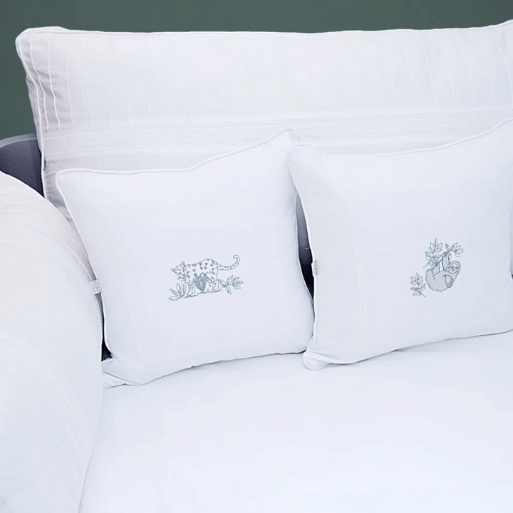 As almofadas decorativas bordadas com onça e bicho-preguiça são os destaques afetivos do kit. São mais do que elementos decorativos – são convites para imaginar, sentir e criar memórias ao lado do bebê. Bordados com arte, representam a brasilidade sensível da coleção Origem.