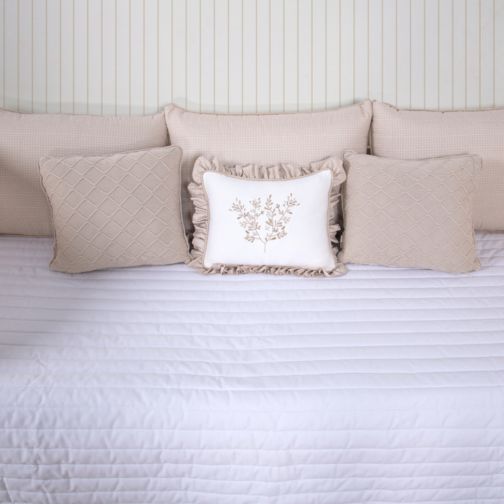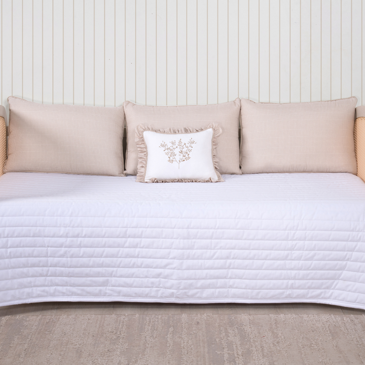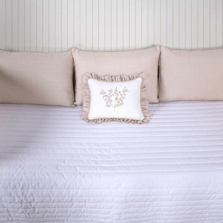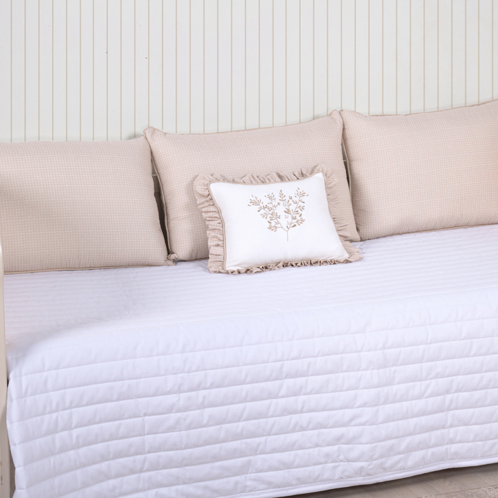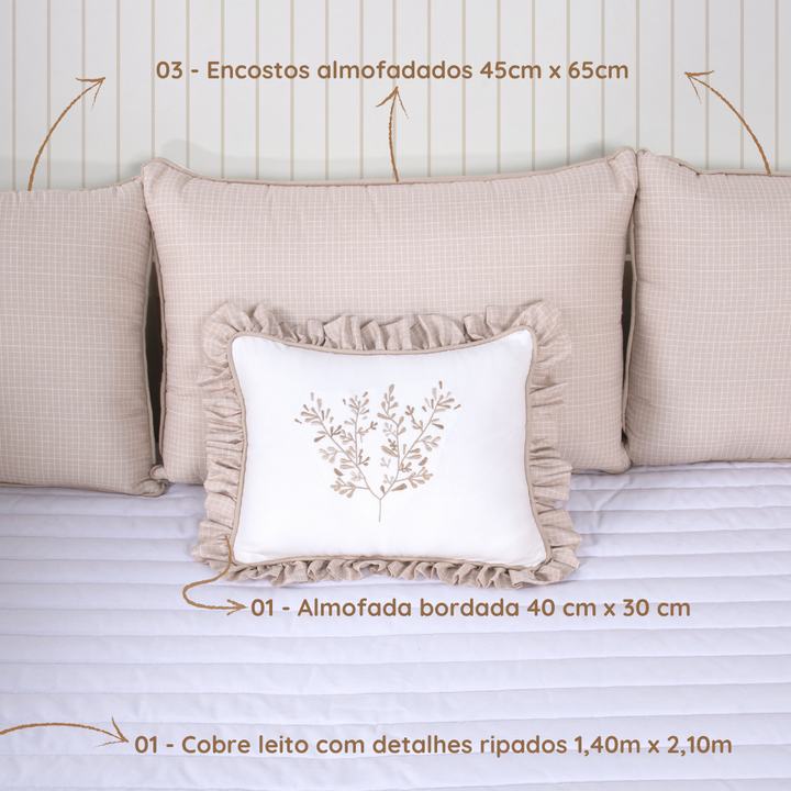 O conjunto é composto por um cobre leito leve e macio, três almofadas encosto estruturadas e uma charmosa almofada bordada com babado, que adiciona delicadeza e um toque romântico ao ambiente. Cada peça possui acabamento limpo, bordados delicados e uma estética natural e atemporal, típica da Aime Baby Kids.
