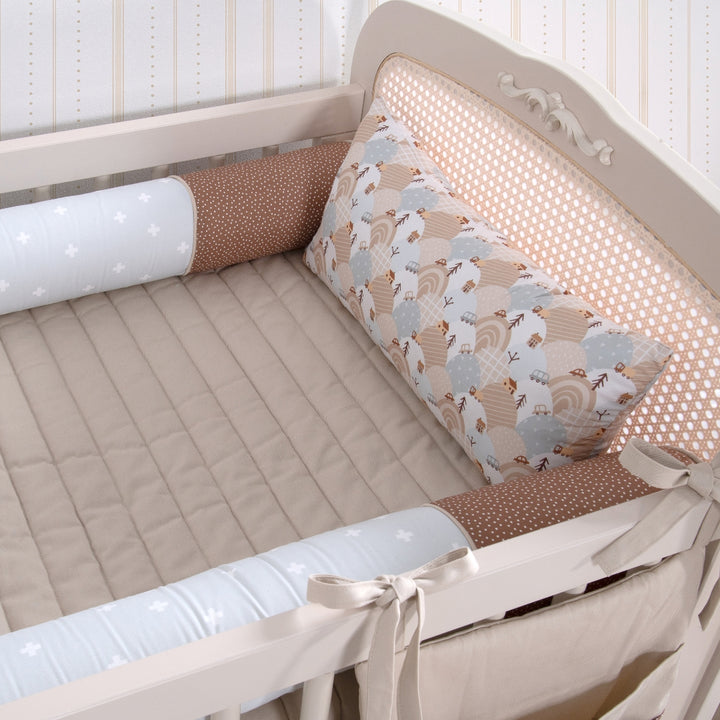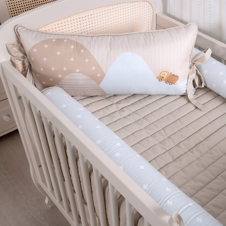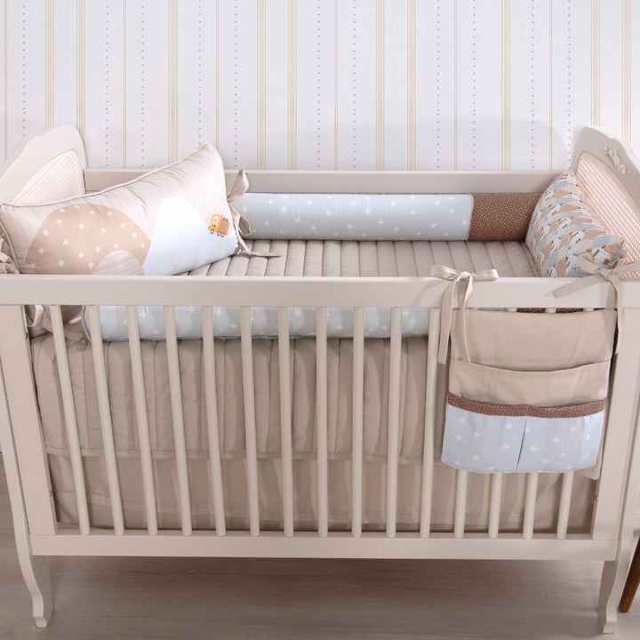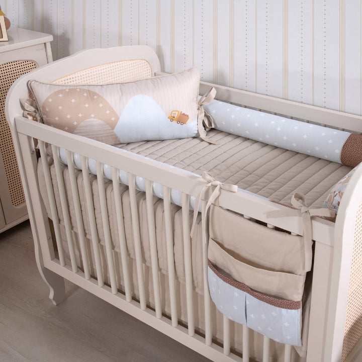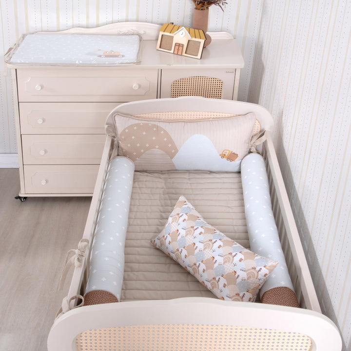 A cabeceira e a peseira estampadas trazem ilustrações delicadas de bichinhos aventureiros e seus transportes, reforçando o universo lúdico da coleção. Os rolinhos laterais, em tecido estampado e toque suave, garantem proteção e acolhimento nos primeiros meses de vida.