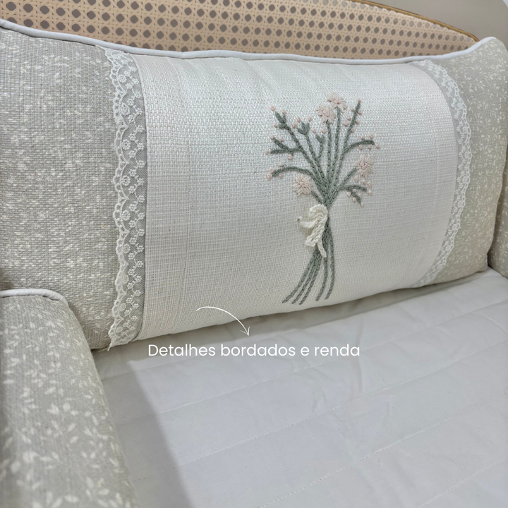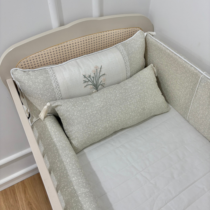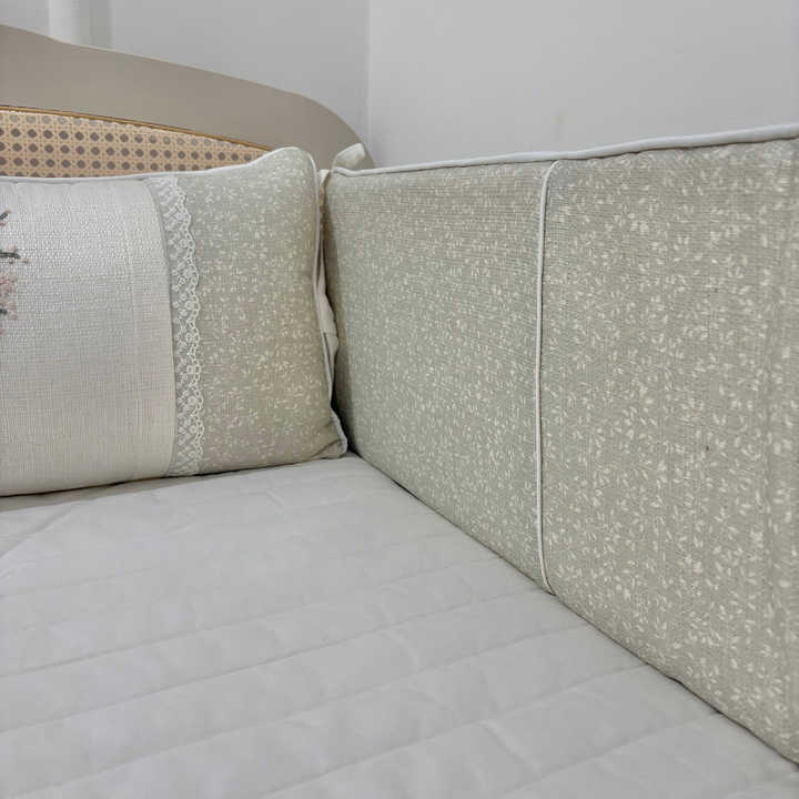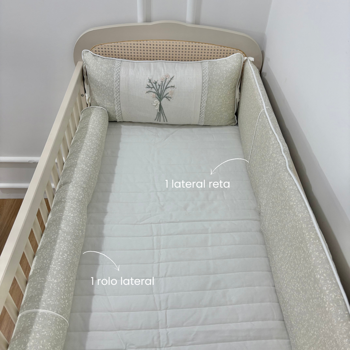 Um encosto contínuo, ideal para proteção completa da parte traseira do berço. Estampa delicada e toque suave, com estrutura que oferece segurança e um visual harmonioso. -