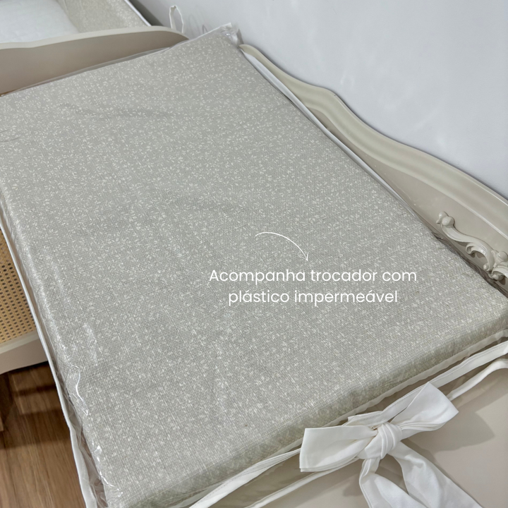 Com base firme e capa em tecido coordenado, o trocador é prático e bonito, tornando o momento do cuidado ainda mais especial.