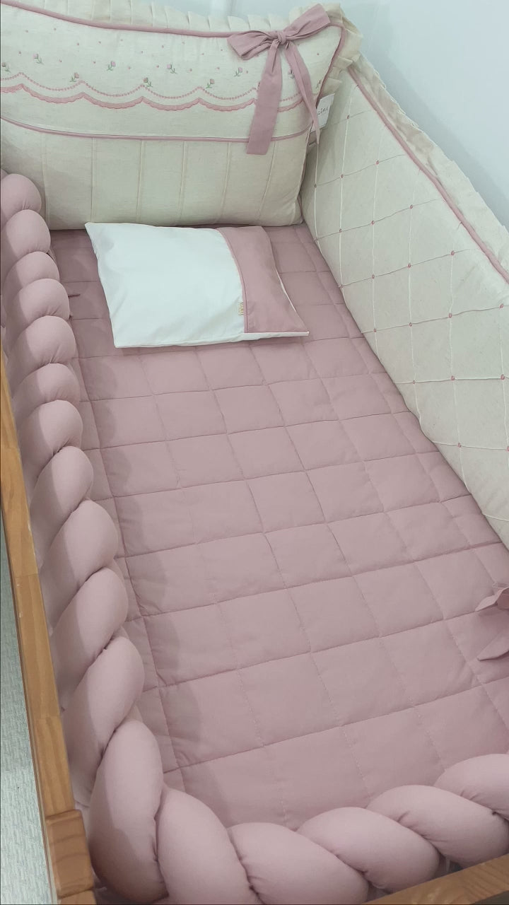 O linho algodão oferece maciez e conforto térmico, ideal para a pele sensível do bebê. Cada detalhe do kit foi desenvolvido para acolher com delicadeza e tornar cada momento no berço mais tranquilo, seguro e especial. A trança lateral agrega proteção com beleza, enquanto o cobre leito e a fronha finalizam o visual com requinte atemporal.