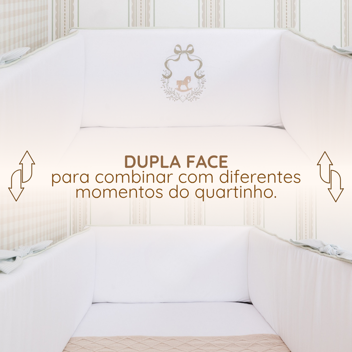 Os protetores envolvem o berço por completo, oferecendo proteção contra impactos e mantendo o bebê mais seguro durante o descanso. Com amarris reforçados, o kit se fixa com firmeza e permanece sempre no lugar, mesmo com o uso diário. Fácil de remover e lavar, é ideal para a rotina das famílias que buscam praticidade sem abrir mão da beleza.