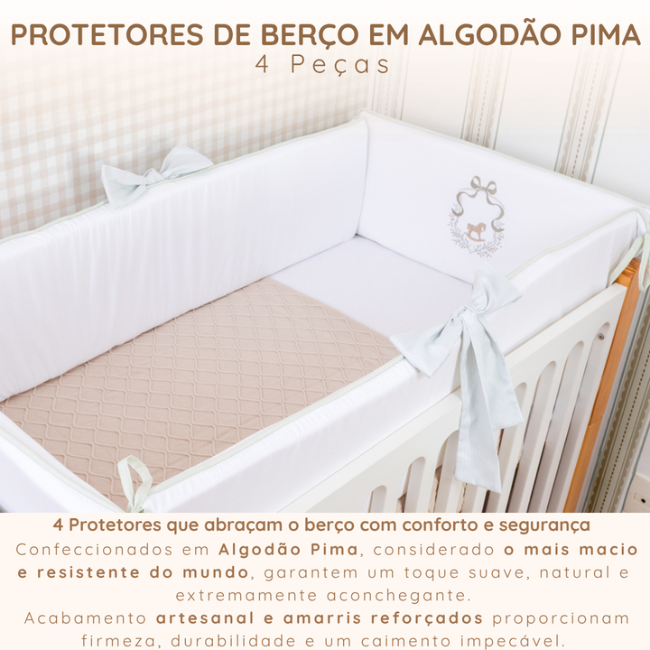 O Kit de Berço em Algodão Pima – Protetores 4 Peças Bordado Verde foi criado para trazer mais conforto, segurança e delicadeza ao berço do seu bebê. Produzido em Algodão Pima, uma das fibras mais nobres e macias do mundo, ele oferece um toque suave, sedoso e naturalmente hipoalergênico — perfeito para a pele sensível do recém-nascido.