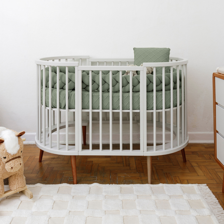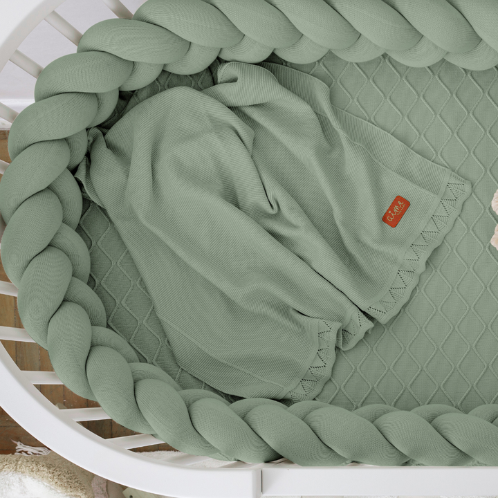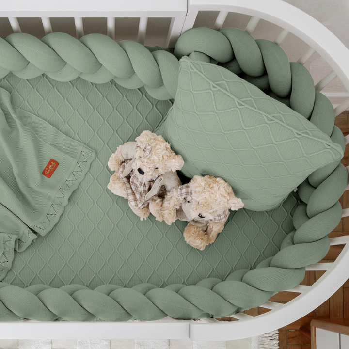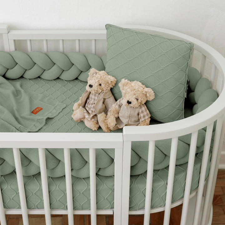 Forma uma barreira macia nas laterais do berço, oferecendo proteção com um visual encantador. Seu design trançado em verde oliva é puro afeto em forma de tricot.