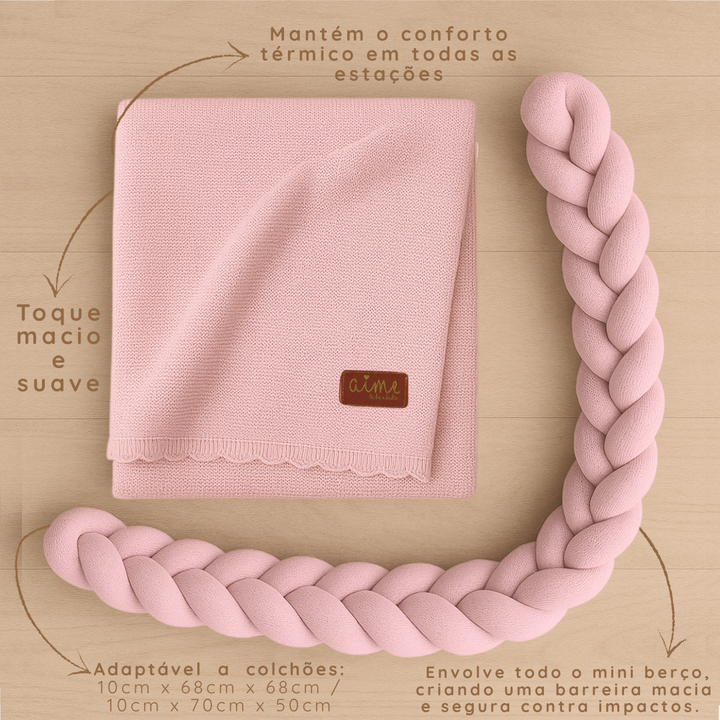 O Kit Mini Berço da Aime foi cuidadosamente pensado para oferecer segurança, conforto e um toque de delicadeza ao cantinho do seu bebê. Composto por uma manta cobre leito macia e uma trança protetora acolchoada, este conjunto é ideal para proporcionar noites mais seguras e aconchegantes.