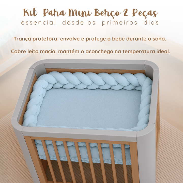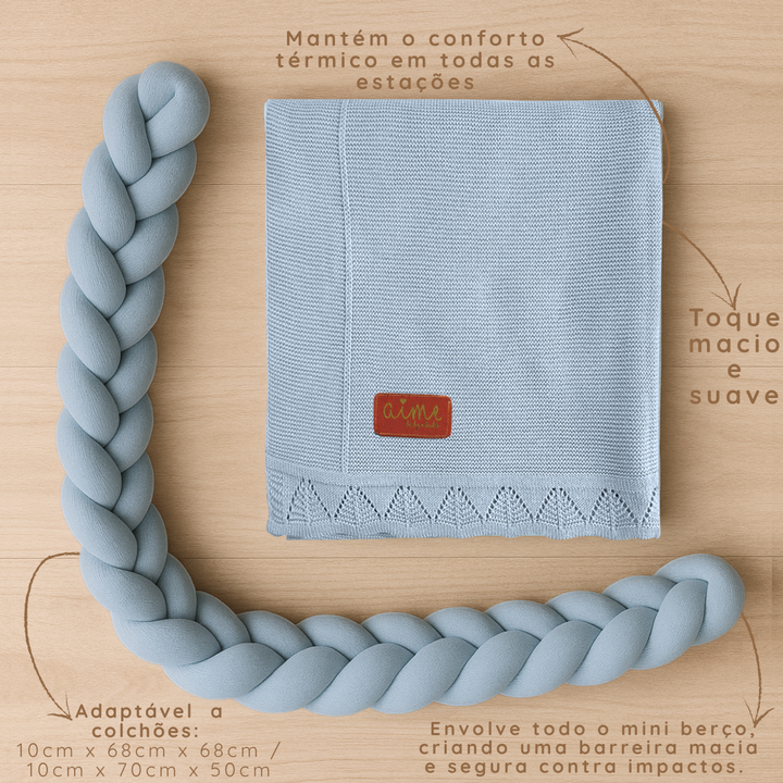 O Kit Mini Berço da Aime foi cuidadosamente pensado para oferecer segurança, conforto e um toque de delicadeza ao cantinho do seu bebê. Composto por uma manta cobre leito macia e uma trança protetora acolchoada, este conjunto é ideal para proporcionar noites mais seguras e aconchegantes.