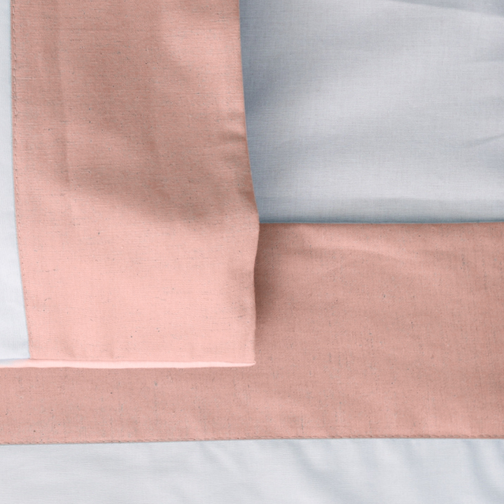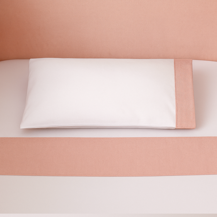 O lençol superior e a fronha possuem vira em linho rosê, que acrescenta textura e charme artesanal ao enxoval.