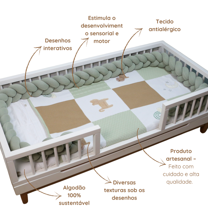 ✔️ Texturas diferenciadas – Estimula o desenvolvimento sensorial e motor. ✔️ Desenhos interativos – Capturam a atenção do bebê e incentivam a imaginação. ✔️ Tecido antialérgico – 100% algodão, seguro para a pele delicada do bebê. ✔️ Ideal para ficar de bruços – Ajuda no fortalecimento muscular e cooperativo. ✔️ Produto artesanal – Feito com cuidado e alta qualidade.