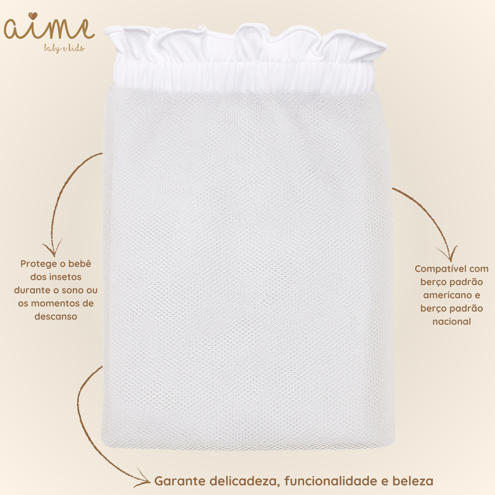 Com caimento suave e visual sofisticado, o mosquiteiro protege o bebê de insetos sem criar barreiras visuais ou de ventilação. Ideal para o uso diário, ele se adapta perfeitamente ao berço e complementa a decoração com delicadeza e cuidado.