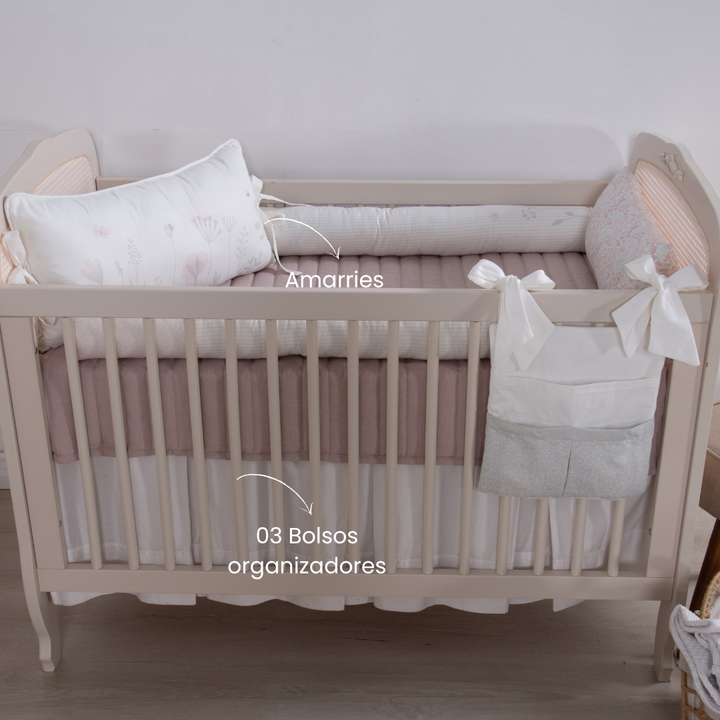 O destaque fica por conta dos laços delicados em tecido, que remetem à suavidade do Jardim da Mamãe e permitem prender o organizador ao berço ou à cômoda com elegância e praticidade. Os bolsos amplos e estruturados oferecem espaço ideal para o dia a dia, sem perder o estilo. 💐