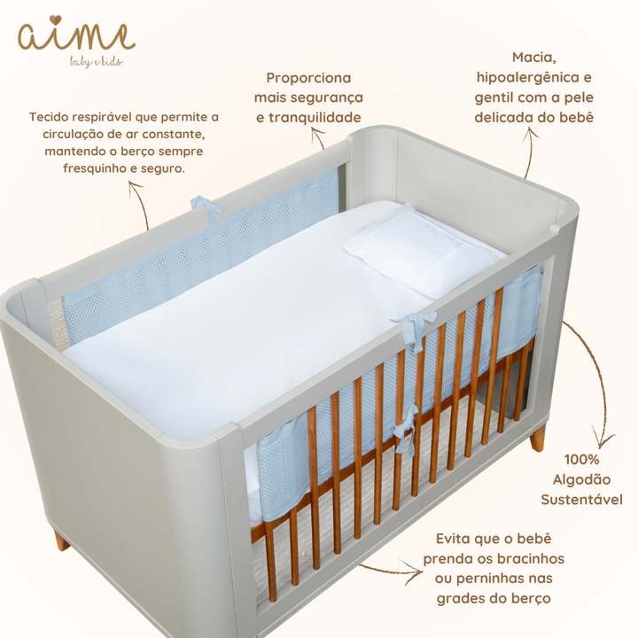 Nossa Tela Respirável Flow foi desenvolvida para proporcionar mais segurança e tranquilidade, evitando que o bebê prenda os bracinhos ou perninhas nas grades do berço. Feita com algodão sustentável 100% puro, ela é macia ao toque, hipoalergênica e gentil com a pele delicada do bebê.