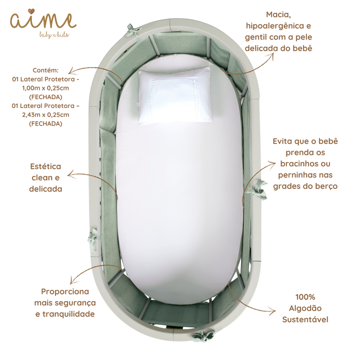 A tela cobre os quatro lados do berço, ideal para modelos com grades palitadas ou berços evolutivos. Seu tecido em tricô respirável protege sem isolar, prevenindo impactos e mantendo o bebê confortável, mesmo em noites mais quentes.
