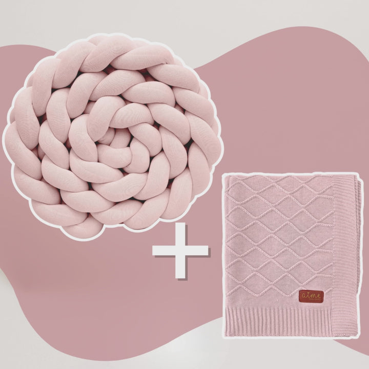O Combo 2 Peças Aime Baby Kids une duas peças essenciais do enxoval — a Trança Protetora de Berço e o Cobertor de Bebê em Tricô 100% Algodão — combinando segurança, conforto e delicadeza em cada detalhe.