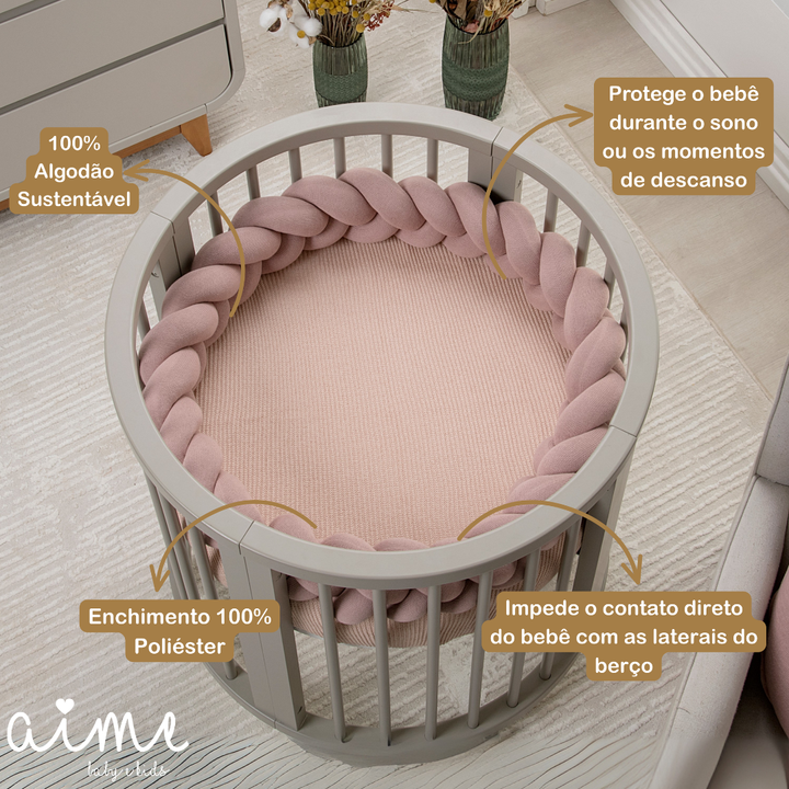 Delicada, funcional e cheia de significado, a Trança Protetora Rosa Velho é a escolha perfeita para envolver o seu bebê com cuidado nos primeiros meses de vida. Confeccionada em tricô com fio de algodão sustentável, ela atua como protetor lateral no mini berço, evitando que o bebê encoste nas grades e oferecendo segurança com suavidade.