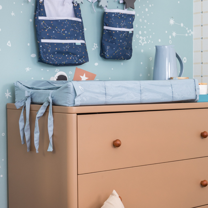 O Trocador Anatômico da Coleção Poesia Linho Azul foi pensado para unir praticidade, segurança e a elegância natural do linho em um só produto.